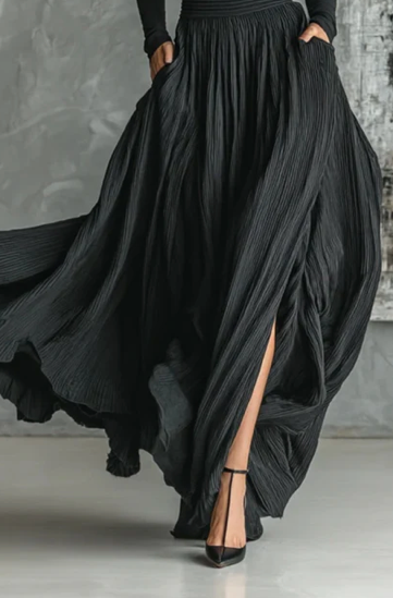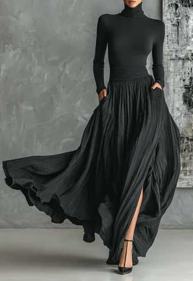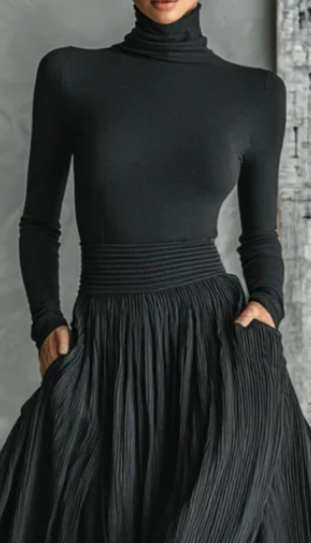 Black Grace - Set cu guler înalt și fustă plisată îmbină rafinamentul cu confortul într-un ansamblu modern și versatil. Bluza mulată cu guler înalt evidențiază silueta cu eleganță, iar fusta plisată adaugă mișcare și farmec ținutei. Realizat dintr-un material moale și elastic, acest set este ideal atât pentru evenimente speciale, cât și pentru zilele casual pline de stil. Negrul complet oferă un aer clasic și sofisticat care nu se demodează niciodată.