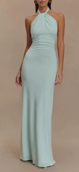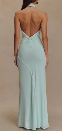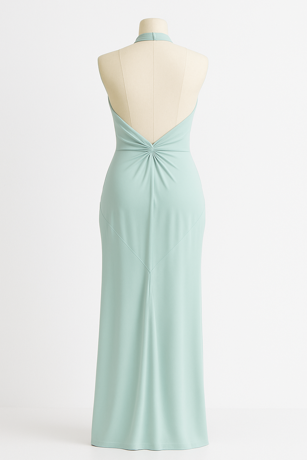 2. Detalii rafinate: decolteu halter, spate gol și drapaje delicate.