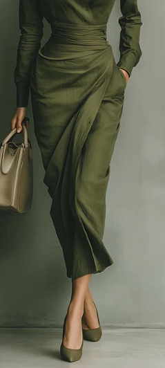 Jungle - Rochie lungă din amestec de bumbac este expresia perfectă a eleganței moderne cu o notă de îndrăzneală. Confecționată dintr-un amestec de bumbac verde militar, această rochie maxi are o croială cambrată și un drapaj rafinat care evidențiază silueta cu grație și stil. Designul minimalist și finisajele impecabile o transformă în alegerea ideală pentru ocazii ce cer eleganță și prezență.